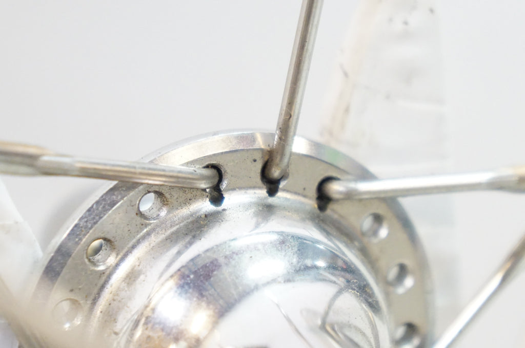 ハブフランジのスポーク穴に、エアロスポークを通すための加工が見受けられます。