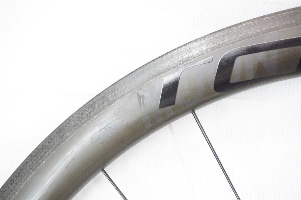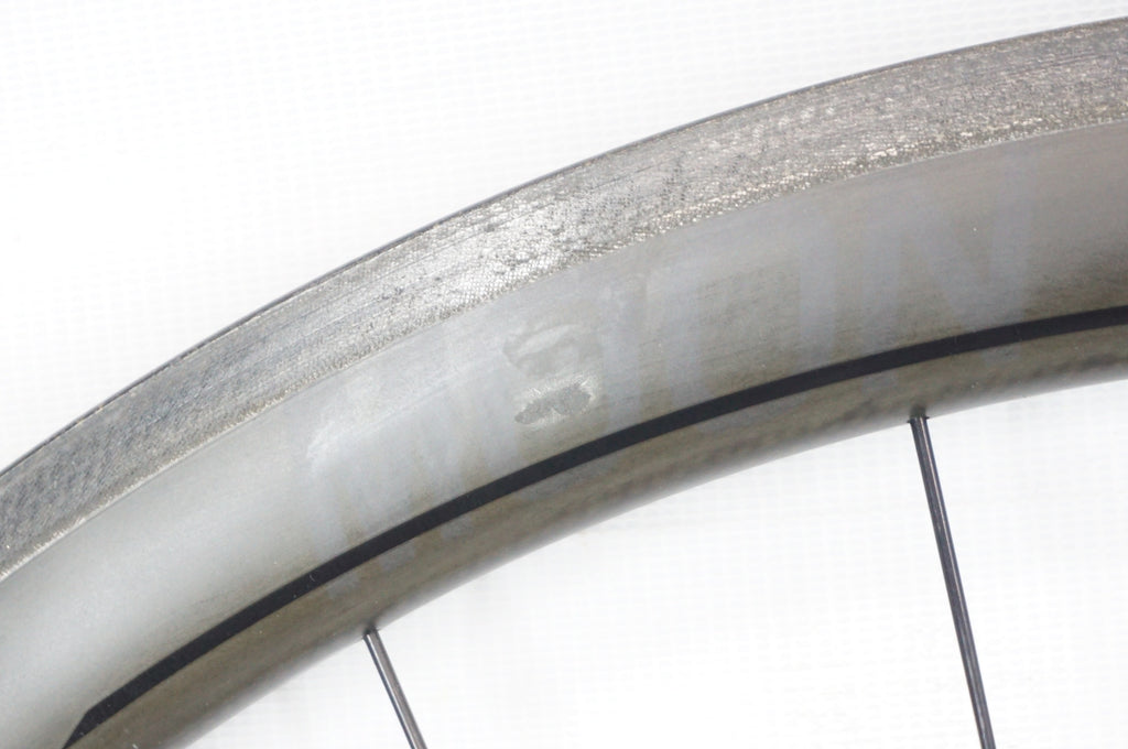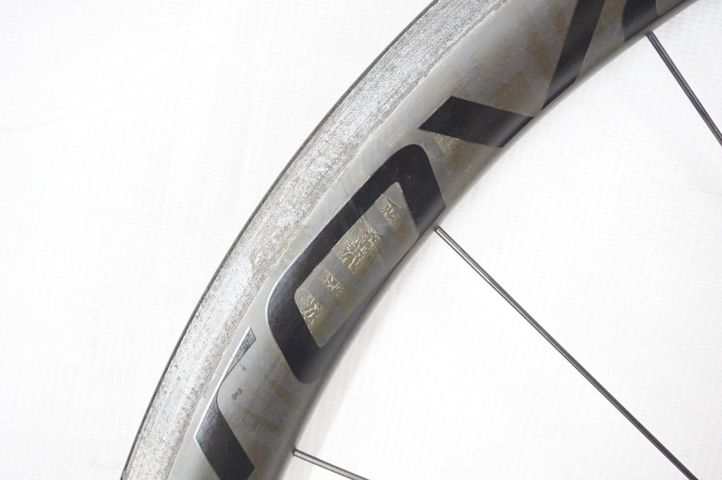 リムにデカールの痕(日焼け)、剥がした際に出来たカーボンの凸凹がございますが、現状割れまでは達して状態ではございません。