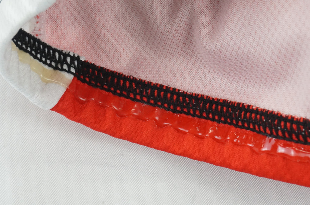 裾の内側にグルーの様なもので滑り止め加工されており、ベタつきがございます。